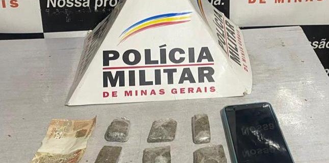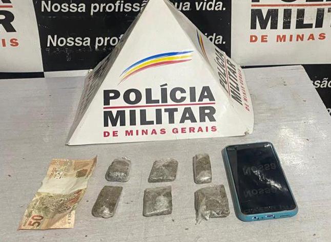 Foi realizada abordagem e durante as buscas foram localizadas no bolso do autor 06 tabletes de maconha e R$50,00.